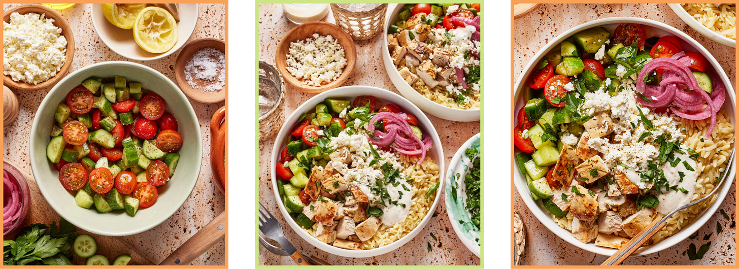 If you aren’t sure what to make for dinner, it’s time to ditch the takeout and reach for these Greek Chicken Orzo Bowls instead. These warm and nourishing bowls are proof that homemade really can be just as good, if not better than, takeout (Cava, I’m looking at you!) These bowls start with a base of tender orzo, topped with juicy, marinated chicken breast, a bright and refreshing tomato and cucumber salad, and are finished off with a dollop of creamy tzatziki, tangy pickled onions, and briny feta cheese. The end result? A flavorful bowl that packs a punch, looks beautiful, and is a dish that the entire family will enjoy!