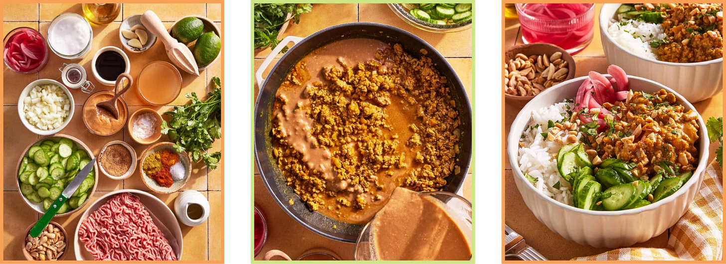 Ground chicken cooked in a rich, creamy peanut coconut sauce — in 15 minutes flat. Served over rice with a quick cucumber salad on top. This is the newest recipe in the rotation and it has already become one of my most made. The sauce is the kind of thing you’ll want to put on everything, and the whole bowl comes together faster than you can order delivery. Everyone loves it and it reheats great the next day. An all-around win!
