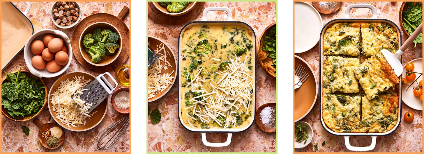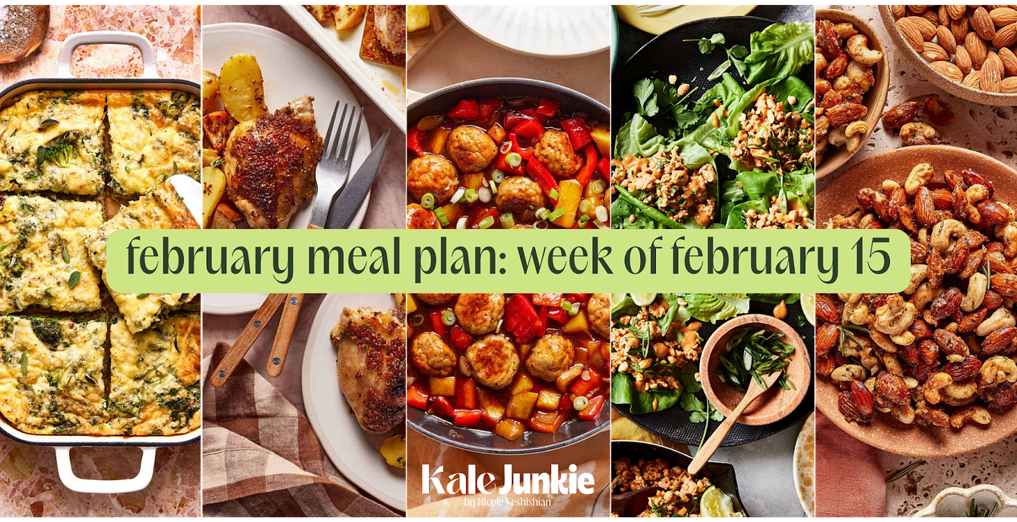 This week, we’ve got breakfast bars that you just have to bake once and enjoy all week. For lunch, we’ve got a one-bowl egg salad that’s creamy, herby, and flexible enough to be eaten on toast, in a wrap, or simply on its own. Our dinners this week are all amazing — a sheet pan recipe for all of us who hate doing the dishes, sweet and sour chicken meatballs that you can stretch further by serving over rice, and lettuce wraps that’ll have you finally canceling that Doordash subscription. And there’s a little snack thrown in here too to hold you over.