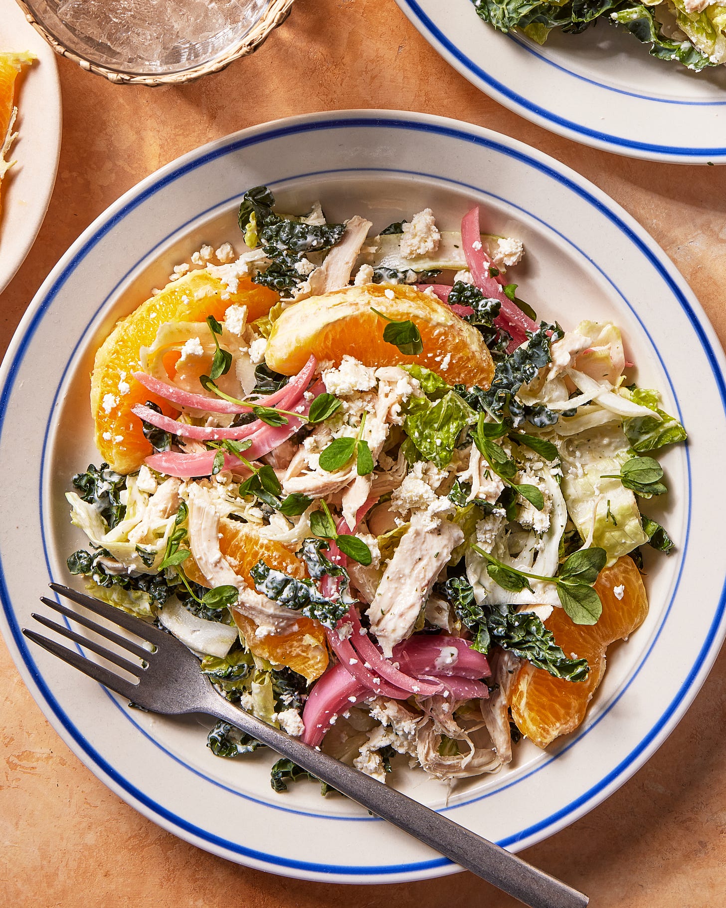 This salad is loaded with crisp lacinato kale, romaine, shredded rotisserie chicken, shaved fennel, juicy orange segments, pickled onions, and crumbled feta — all tossed in a creamy homemade “granch” dressing.