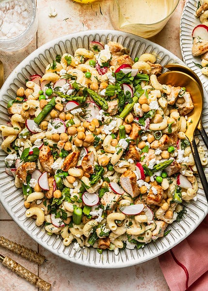 And finally, assemble your salad! In the bowl with the pasta, asparagus and peas, add the chickpeas, green onions, radishes, parsley, dill, and cooked chicken. Pour remaining dressing on top, toss, and add crumbled feta on top.