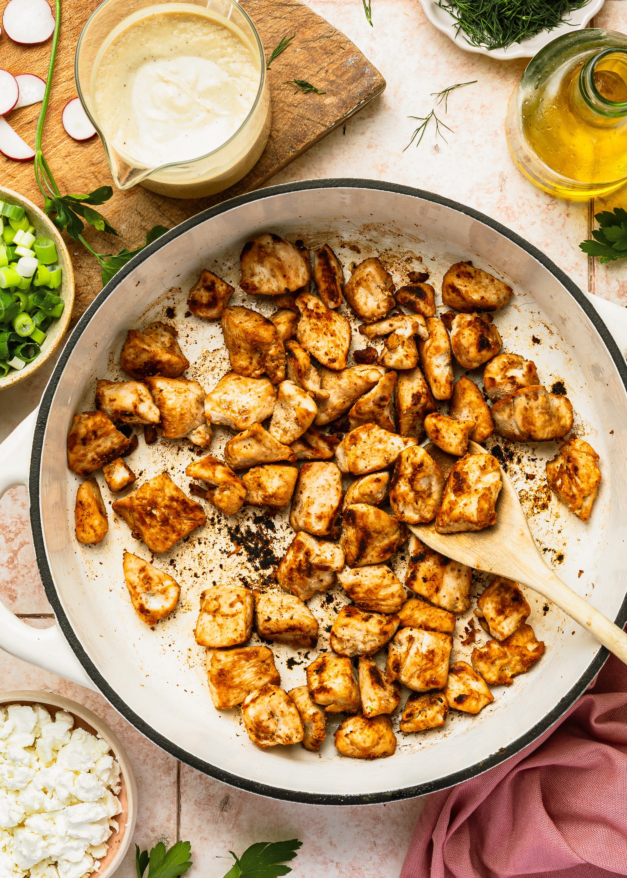 Cube the chicken breasts into tiny bite sized pieces. Toss with 1/4 of the dressing. Cook in a cast-iron skillet until cooked through. Since chicken breast is on the drier side, once it is done cooking, let meat rest for a bit then take a fork and break it down/mash into smaller pieces in order for the meat to soak in the pan juices (see video).