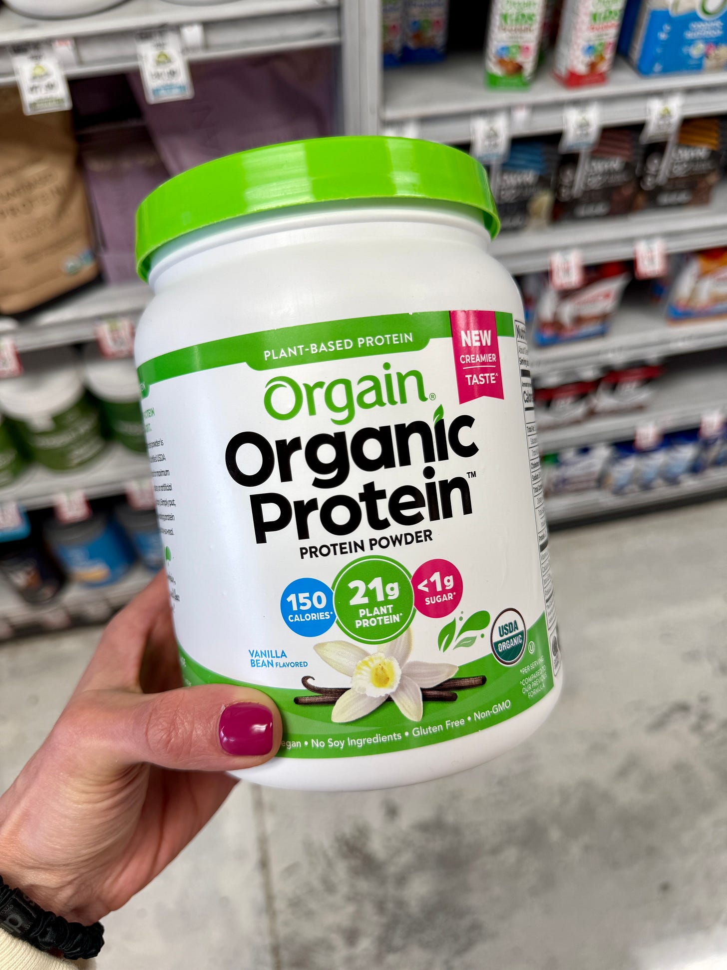 Orgain—Orgain is my least favorite of the bunch, but still one I use probably once a week. It’s certified organic, easy to find in stores and often on sale- making it the most affordable of the bunch, and my kids really like it because it tastes like more of a dessert than a bland protein (and yes, kids can take this). Each serving contains 21 grams of plant based protein and they’ve added prebiotic fiber to help with digestion. I think what makes this my least favorite is that it does have a stevia aftertaste and it can be gritty depending on what I blend it with. It comes in a bunch of different flavors, but I keep it simple and always have the vanilla in my pantry.