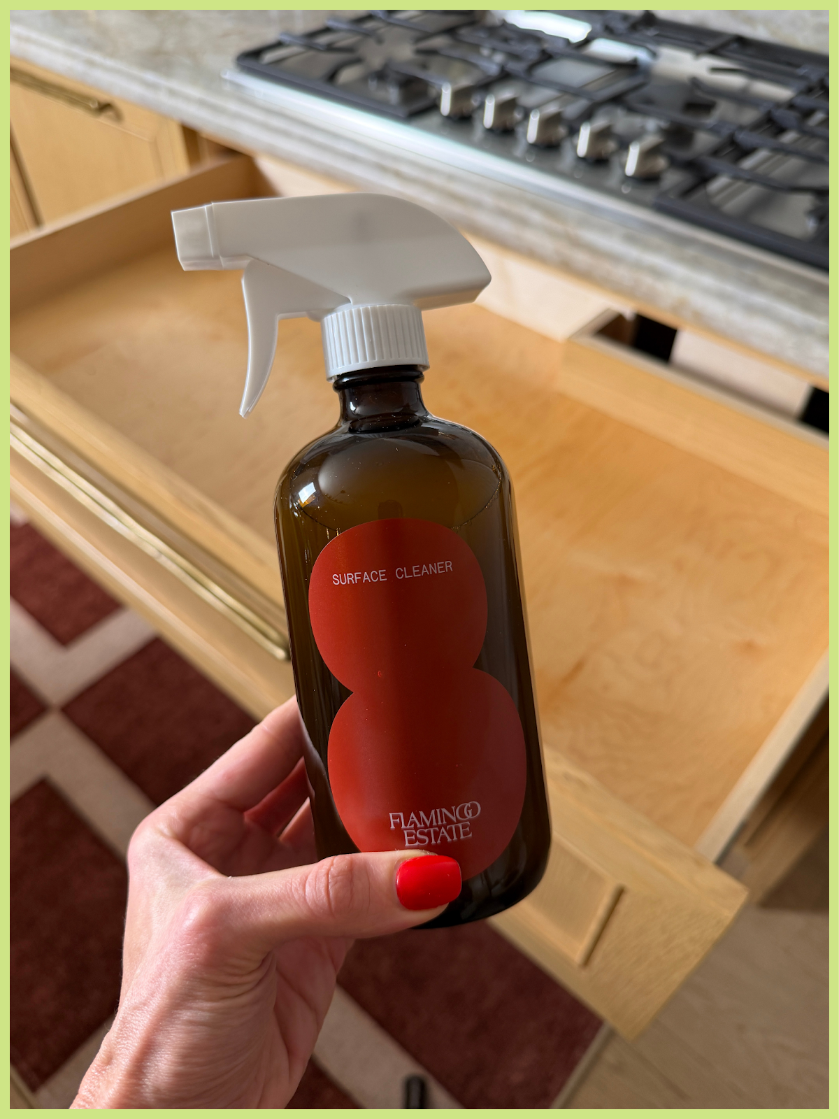 Let’s start off with the most basic thing — clean surfaces. Before I organize anything, I wipe everything down so it’s nice and clean. Counters, shelves, drawers, fridge shelves, everything. I swear by Flamingo Estate surface spray. It smells incredible and works really well. This is my non-negotiable first step.