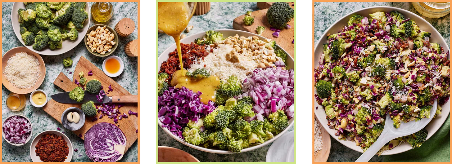 The best meal-prep salad on this entire list—my Crunchy Broccoli Salad with Honey Dijon Vinaigrette. Broccoli and cabbage don’t get soggy — they actually get better as they sit in the dressing. Add cashews, bacon, freshly grated parmigiano reggiano, and a honey dijon dressing and you have a salad that holds up in the fridge for days and gets better with time. I prep this on Sundays and eat it all week.