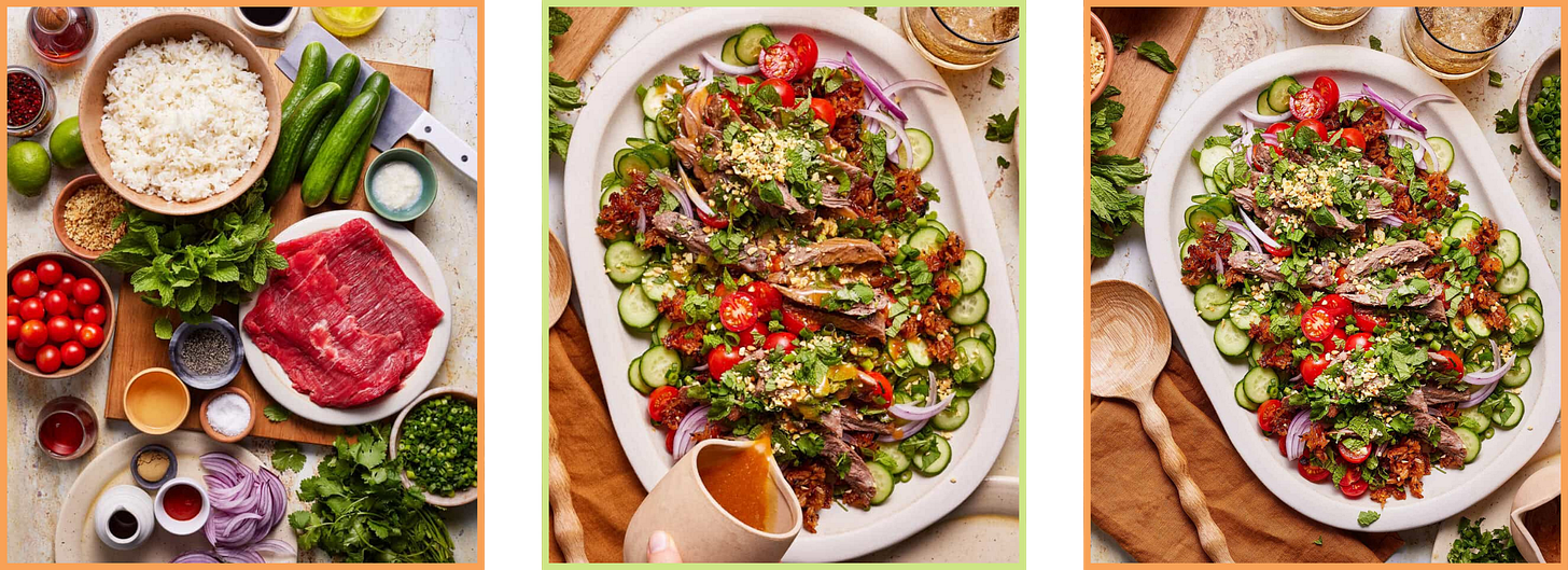 For the nights when you want something that feels a little more elevated. Skirt steak is one of my favorite cuts — it cooks fast, it’s tender, and it absorbs flavor perfectly. In this Crispy Rice Steak Salad with Thai-Inspired Dressing, it sits on top of crunchy cucumbers, fresh herbs, salted peanuts, and crispy chili-sesame rice, all finished with a tangy Thai-inspired dressing with sriracha and lime.