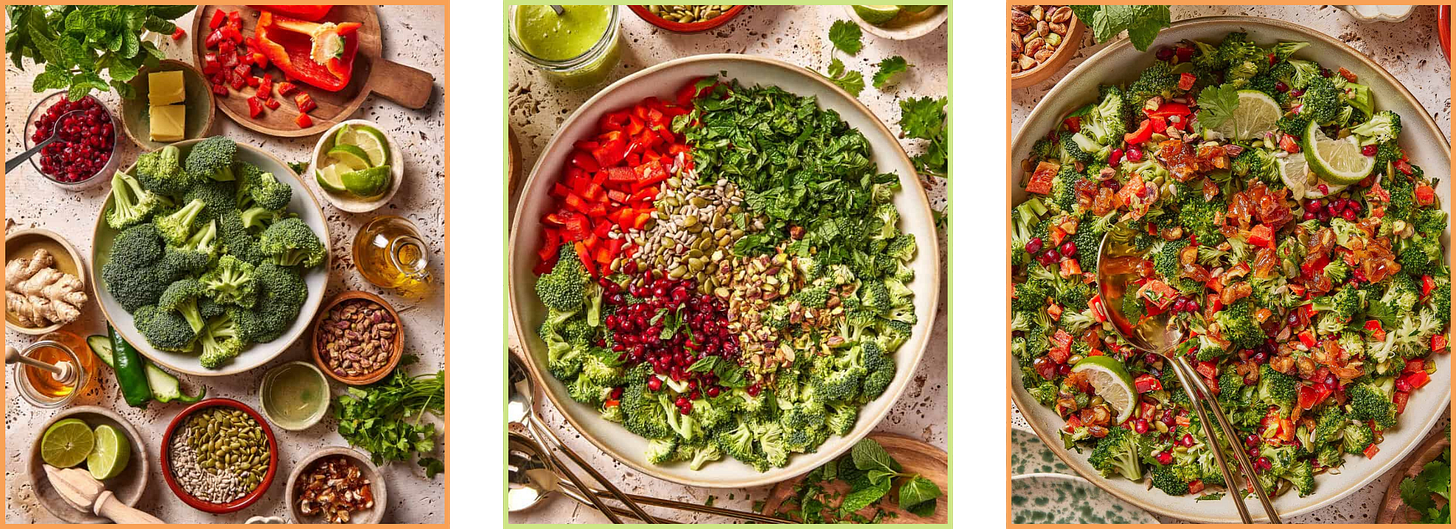 Mix textures. Texture is everything. A salad that’s all soft or all crunchy gets boring fast. I always like to think in terms of contrast: something crisp (lettuce, cucumbers, broccoli), something creamy (avocado, cheese, a creamy dressing), and something chewy or hearty (grains, protein, roasted veggies). When you build in different textures, every bite feels interesting, and you’re much more likely to actually enjoy eating it instead of forcing your way through it.