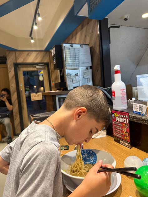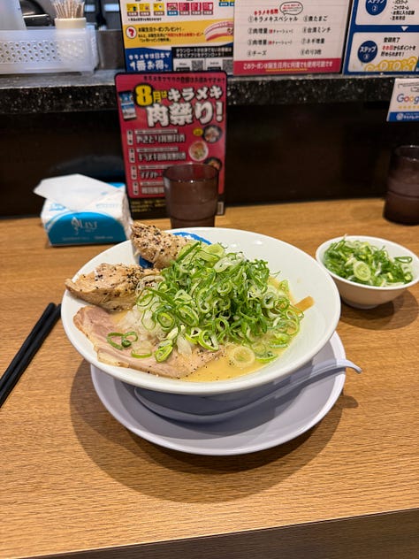 Dinner: No reservation. Our driver recommended a ramen shop—it was closed, so we wandered until we found one nearby. It turned out to be phenomenal. Truly, there are no bad meals in Japan.